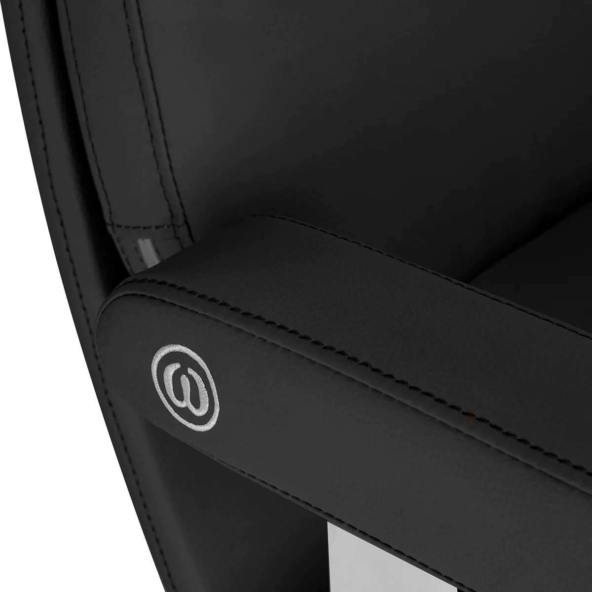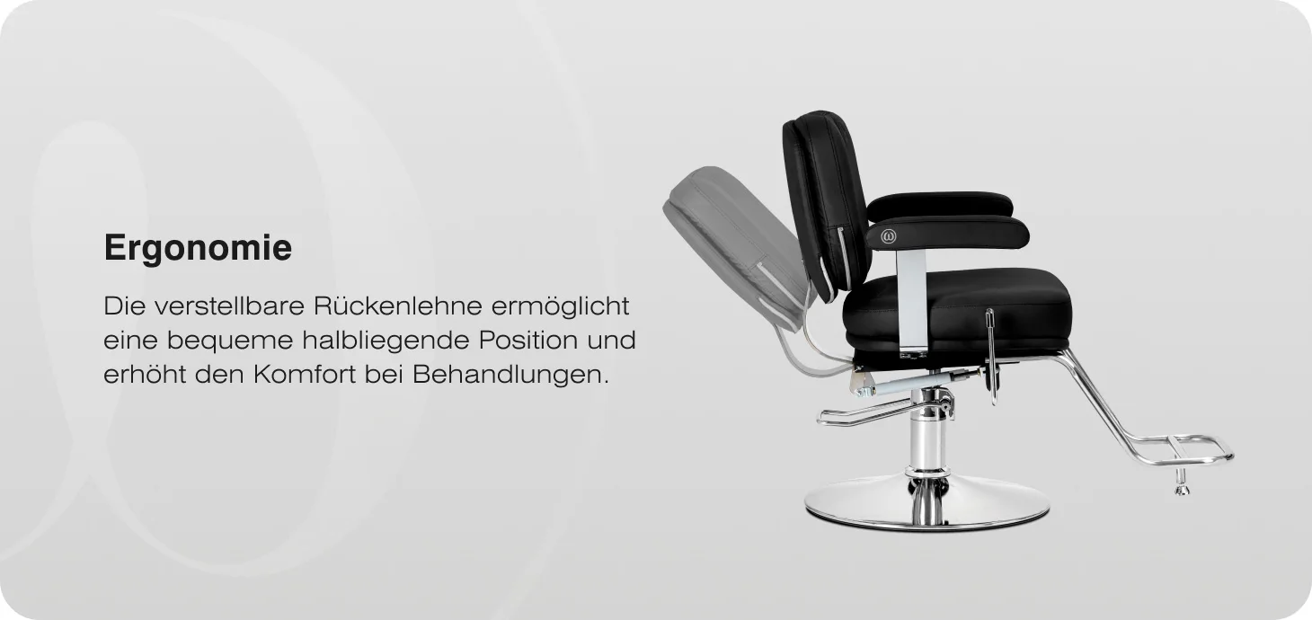 Die konturierte Rückenlehne bietet stabilen Halt und unterstützt eine angenehme Sitzposition auch bei längeren Behandlungen. Die integrierte Fußstütze sorgt für eine entspannte, sichere Abstützung der Füße und trägt zu einem rundum positiven Kundenerlebnis bei.