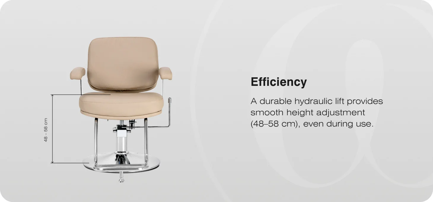 Effizienz, Langlebigkeit und Komfort Der robuste hydraulische Hubmechanismus ermöglicht eine stufenlose Höhenverstellung des Sitzes von 48 bis 58 cm, auch während der Nutzung. Dadurch lässt sich die Arbeitsposition ergonomisch an die Körpergröße von Kunde und Stylist anpassen — für mehr Komfort und Effizienz im Salonalltag.