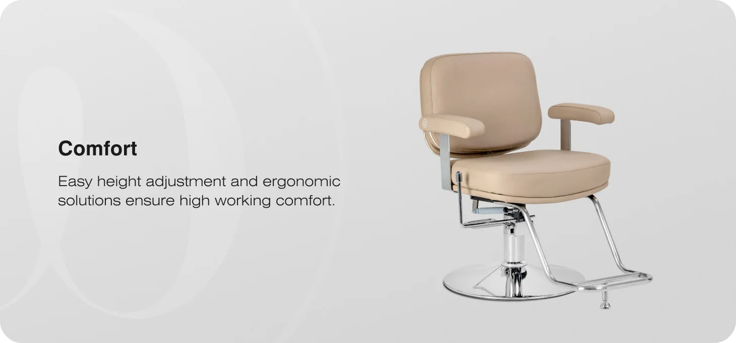 Neigbare Rückenlehne: ermöglicht eine halb liegende, bequeme Position für spezielle Behandlungen. Ergonomische, gepolsterte Armlehnen: bieten stabilen Halt und angenehme Unterstützung. Breite Sitzfläche: sorgt für Bewegungsfreiheit und ein komfortables Sitzgefühl. Voll-Drehmechanismus: erleichtert das Arbeiten rund um den Kunden und ermöglicht einen schnellen, flexiblen Zugriff aus jeder Richtung.