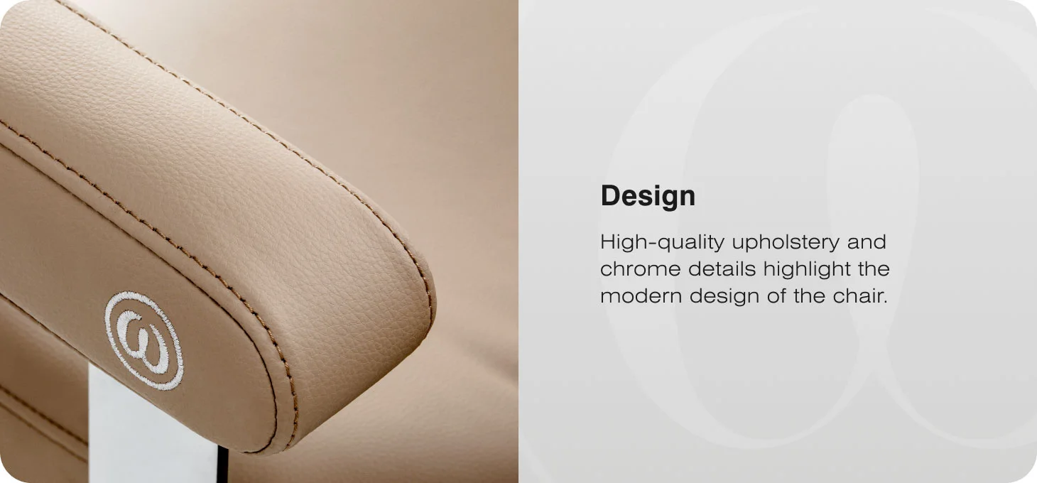 Die konturierte Rückenlehne bietet stabilen Halt und unterstützt eine angenehme Sitzposition auch bei längeren Behandlungen. Die integrierte Fußstütze sorgt für eine entspannte, sichere Abstützung der Füße und trägt zu einem rundum positiven Kundenerlebnis bei.
