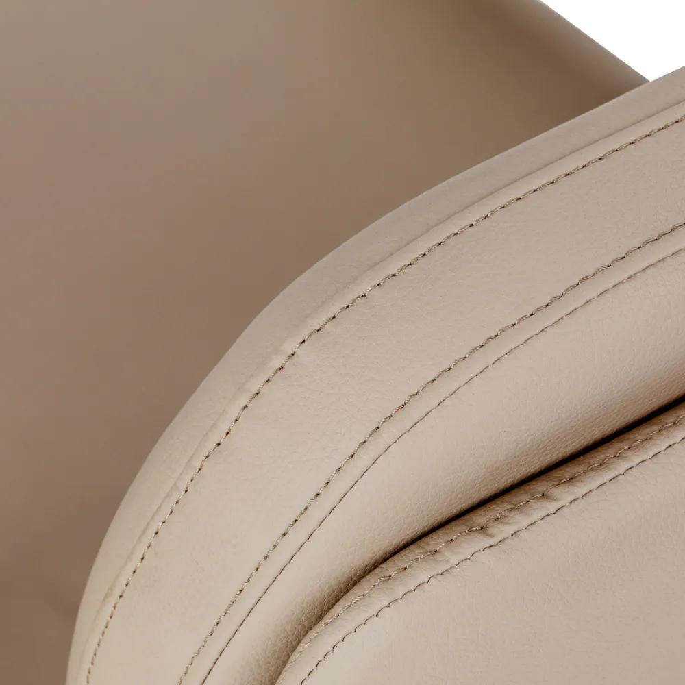 Die konturierte Rückenlehne bietet stabilen Halt und unterstützt eine angenehme Sitzposition auch bei längeren Behandlungen. Die integrierte Fußstütze sorgt für eine entspannte, sichere Abstützung der Füße und trägt zu einem rundum positiven Kundenerlebnis bei.