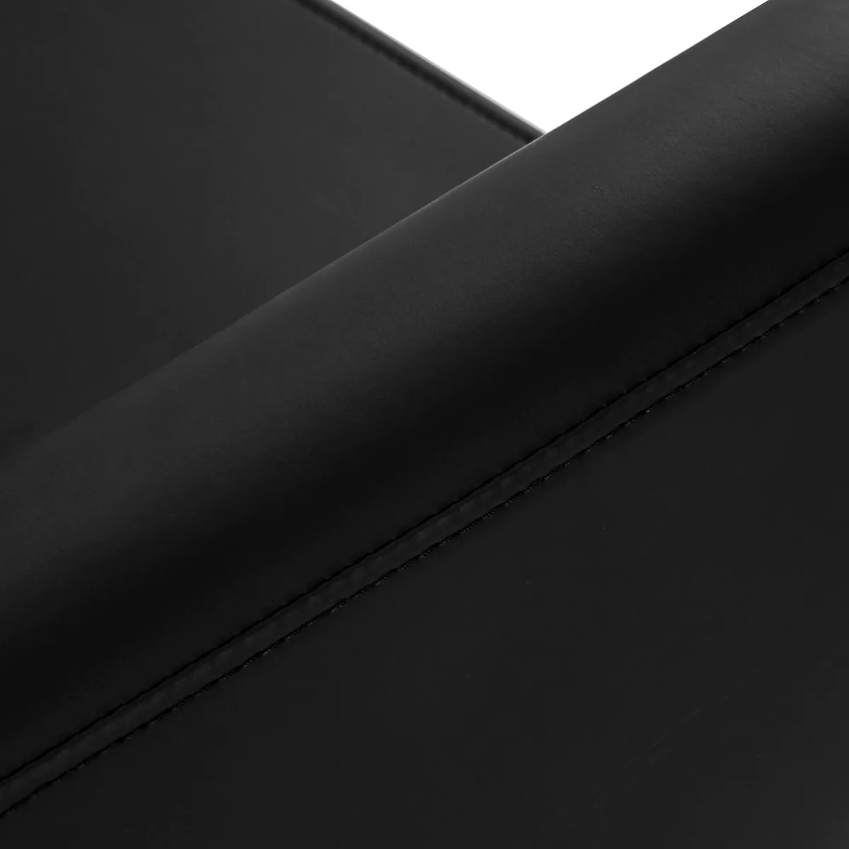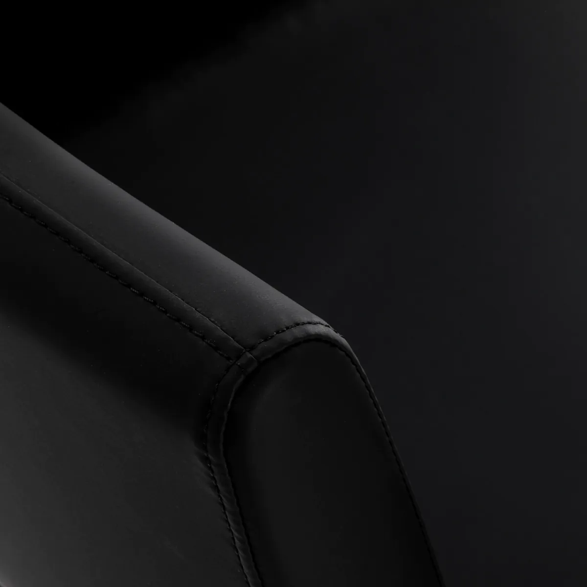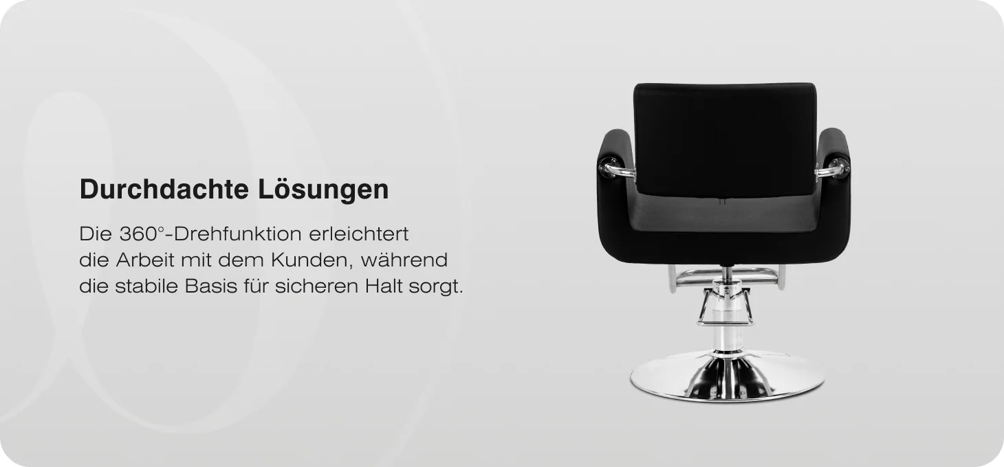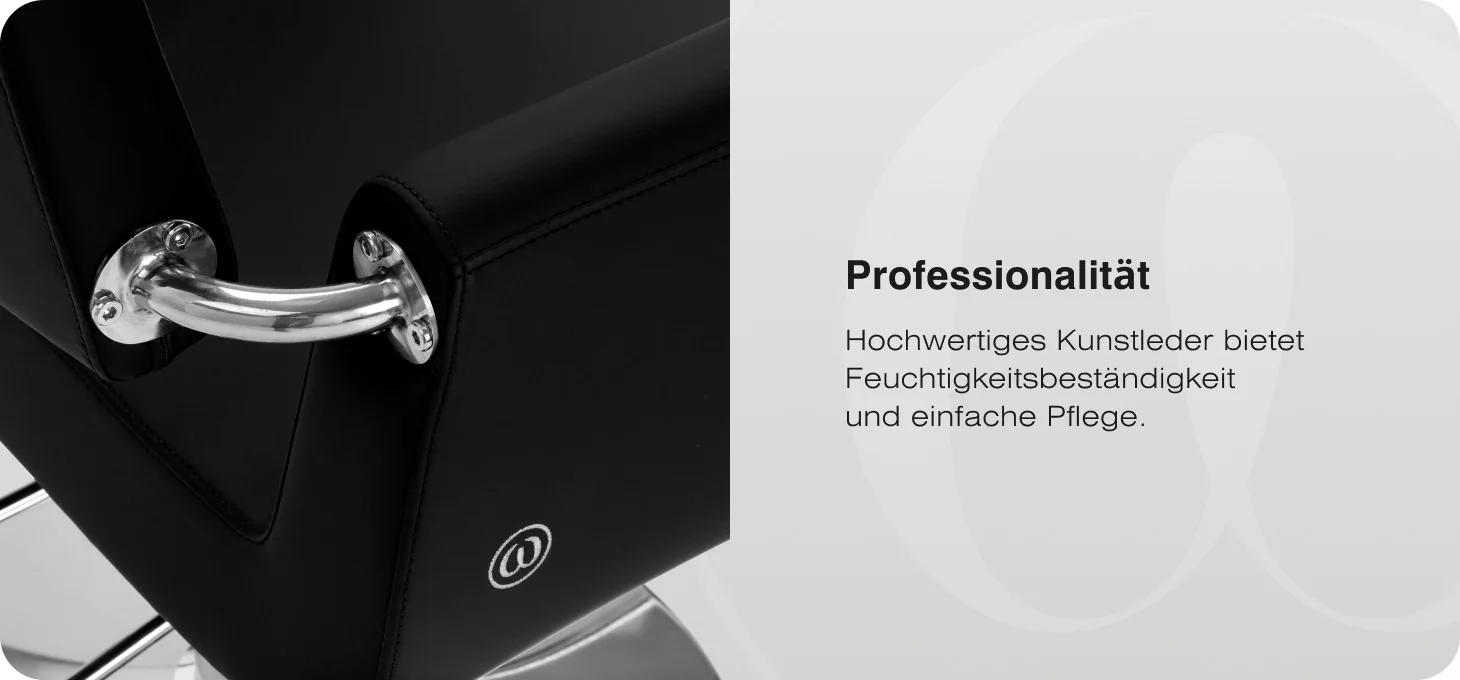 Die hochwertige Polsterung aus schwarzem Kunstleder ist feuchtigkeitsbeständig, langlebig und leicht zu reinigen — ideal für den intensiven Einsatz im Friseursalon.