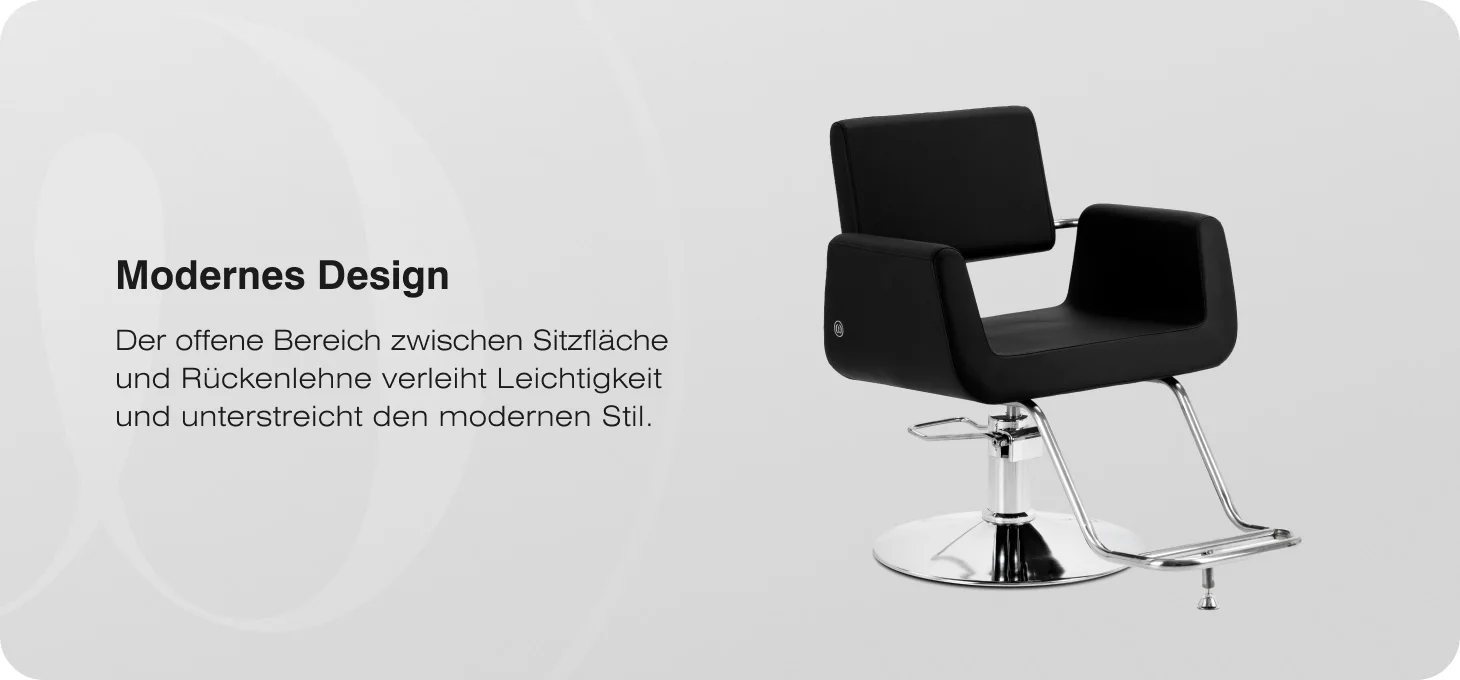 Der Coiffeurstuhl Lydia Schwarz kombiniert minimalistisches Design mit hoher Funktionalität und einer besonders leichten, modernen Form. Der charakteristische offene Raum zwischen Sitzfläche und Rückenlehne verleiht dem Stuhl eine elegante optische Leichtigkeit und erleichtert gleichzeitig die Reinigung im Salonalltag.