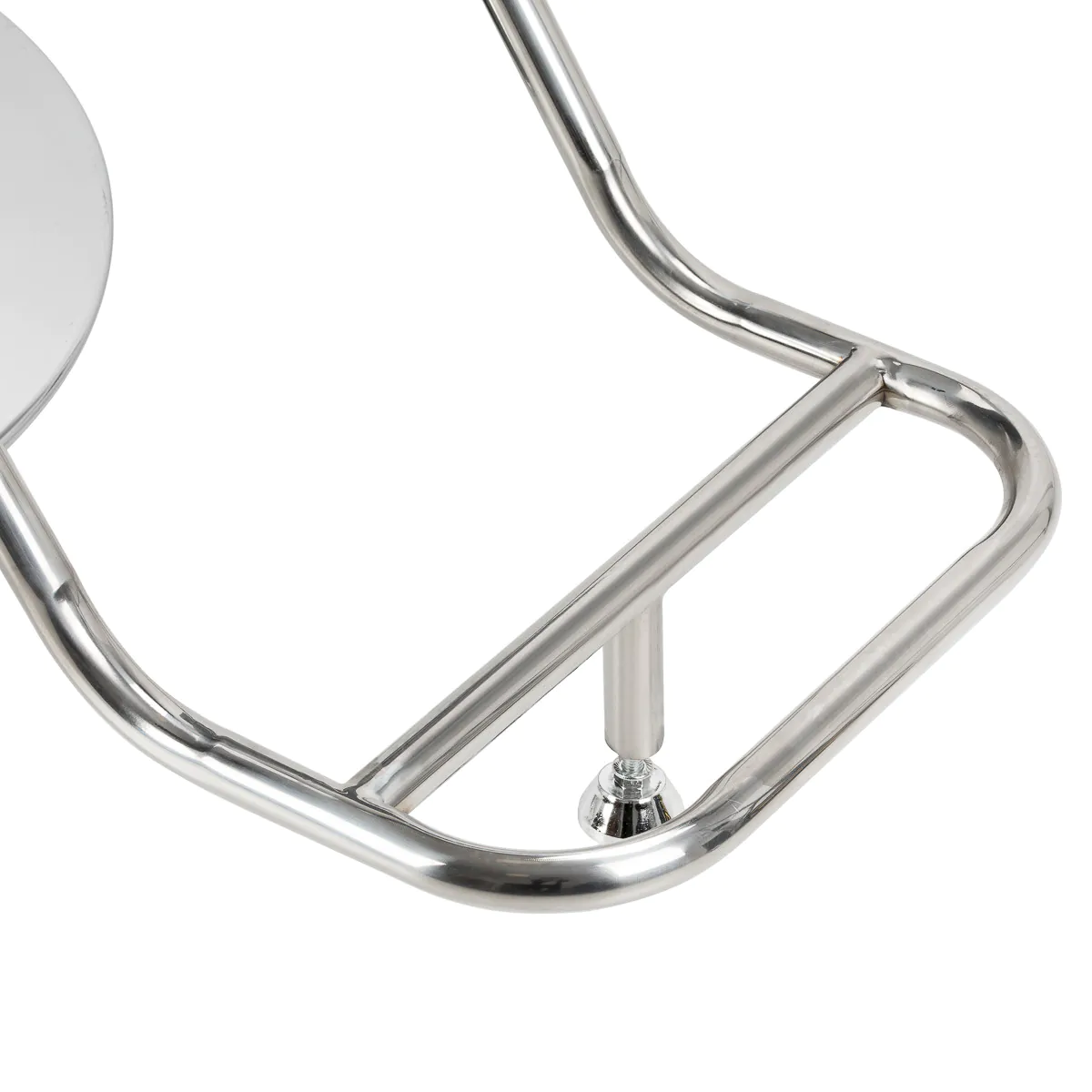 Das Metallgestell und die robuste Fußstütze unterstreichen den modernen Charakter des Stuhls und bilden eine harmonische, ästhetische Gesamtform.