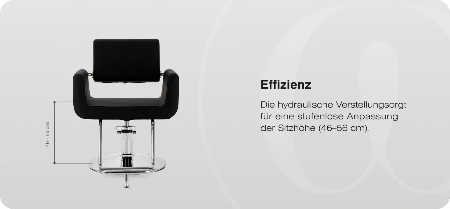 Der hydraulische Heber ermöglicht eine stufenlose Höhenverstellung von 46 bis 56 cm, auch während der Nutzung. Dadurch lässt sich die Sitzposition ergonomisch an die Körpergröße von Kunde und Stylist anpassen — ideal für effizientes, rückenschonendes Arbeiten.