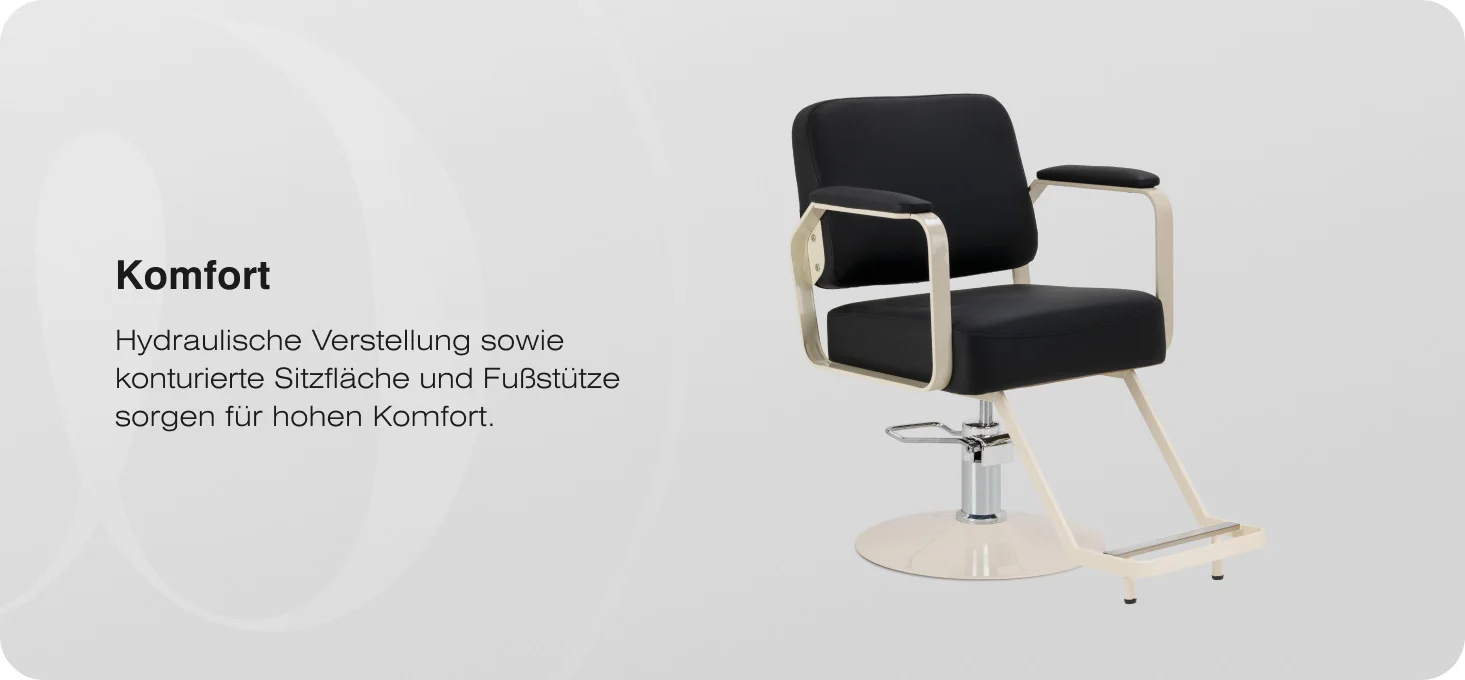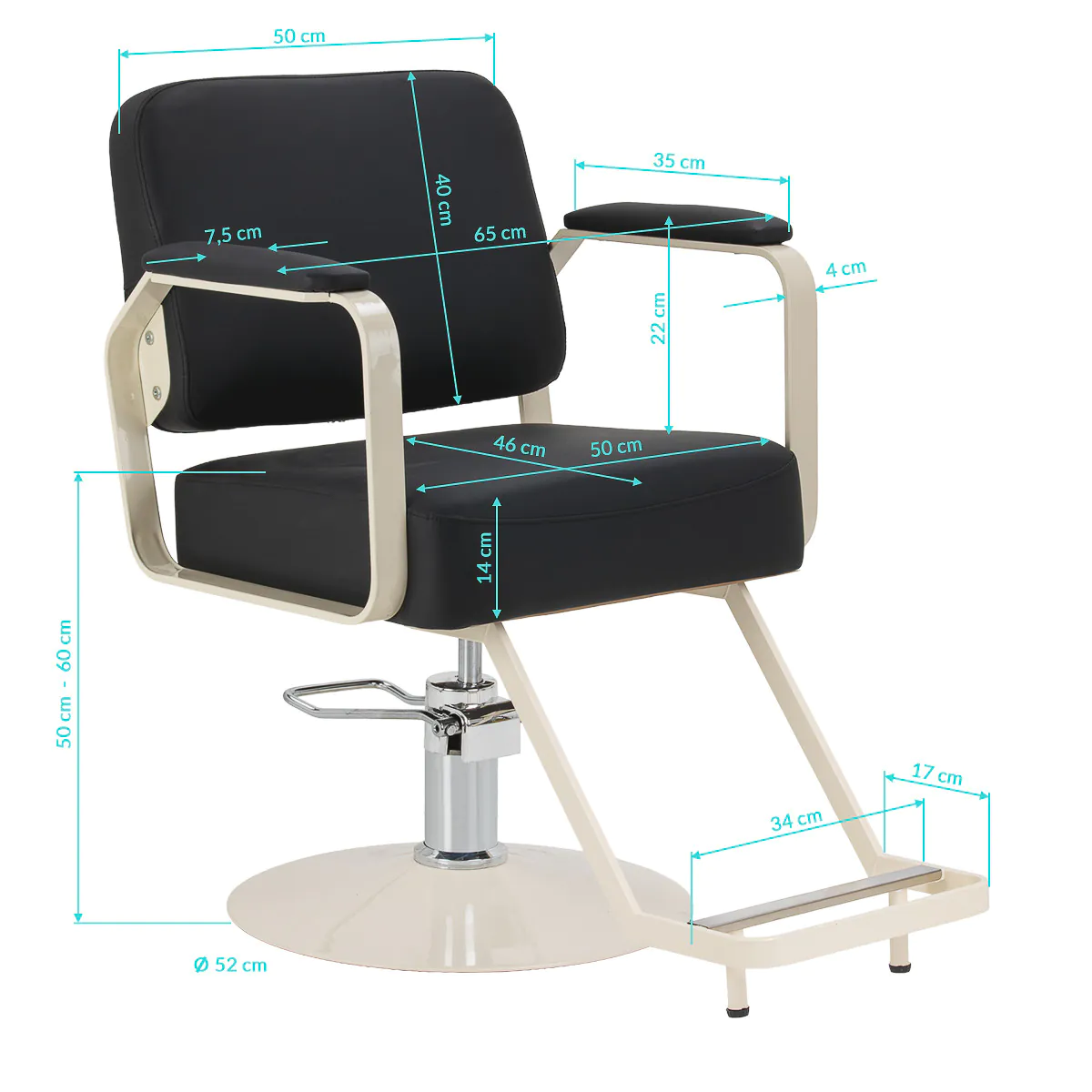 Der robuste hydraulische Heber ermöglicht eine stufenlose Höhenverstellung von 49 bis 59 cm, auch während der Nutzung. Dadurch lässt sich die Sitzposition ergonomisch an die Körpergröße von Kunde und Stylist anpassen — ideal für effizientes, rückenschonendes Arbeiten.