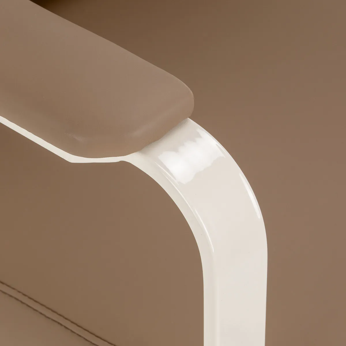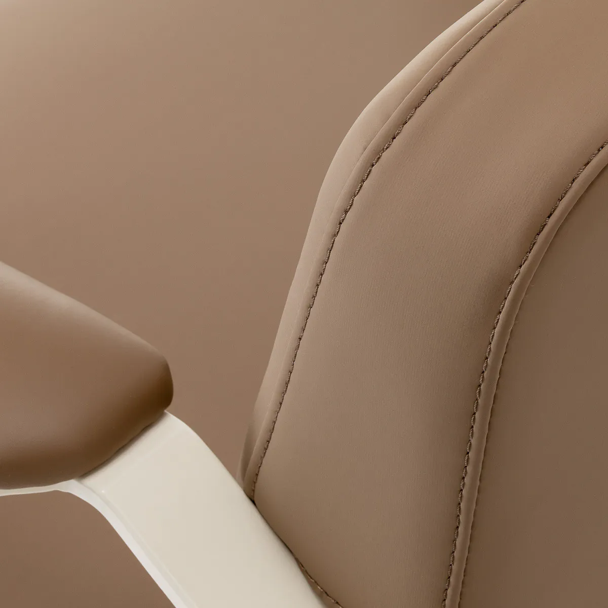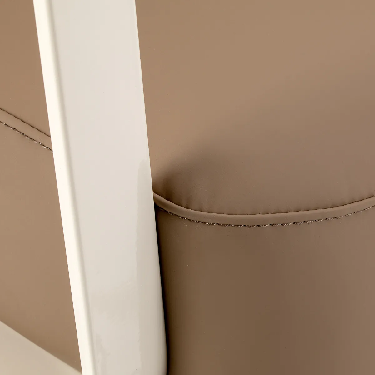 Der elegante runde Sockel in Beigetönen unterstreicht den modernen Charakter des Modells. Die hochwertige Polsterung aus beigem Kunstleder bietet angenehmen Sitzkomfort, ist langlebig, feuchtigkeitsbeständig und leicht zu reinigen — ideal für den professionellen Einsatz.