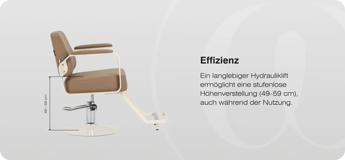 Der robuste hydraulische Heber ermöglicht eine stufenlose Höhenverstellung von 49 bis 59 cm, auch während der Nutzung. Dadurch lässt sich die Sitzposition ergonomisch an die Körpergröße von Kunde und Stylist anpassen — ideal für effizientes, rückenschonendes Arbeiten.